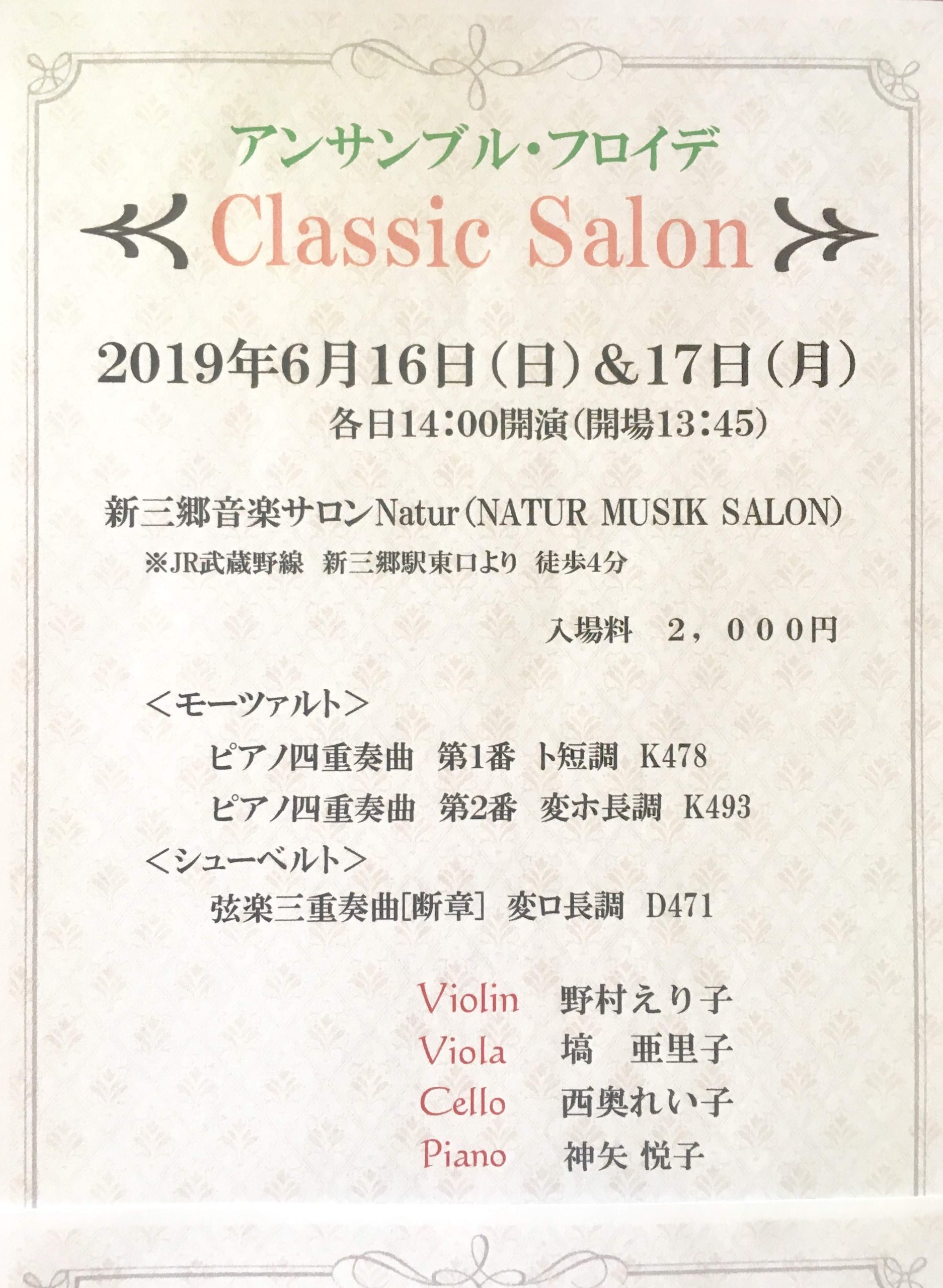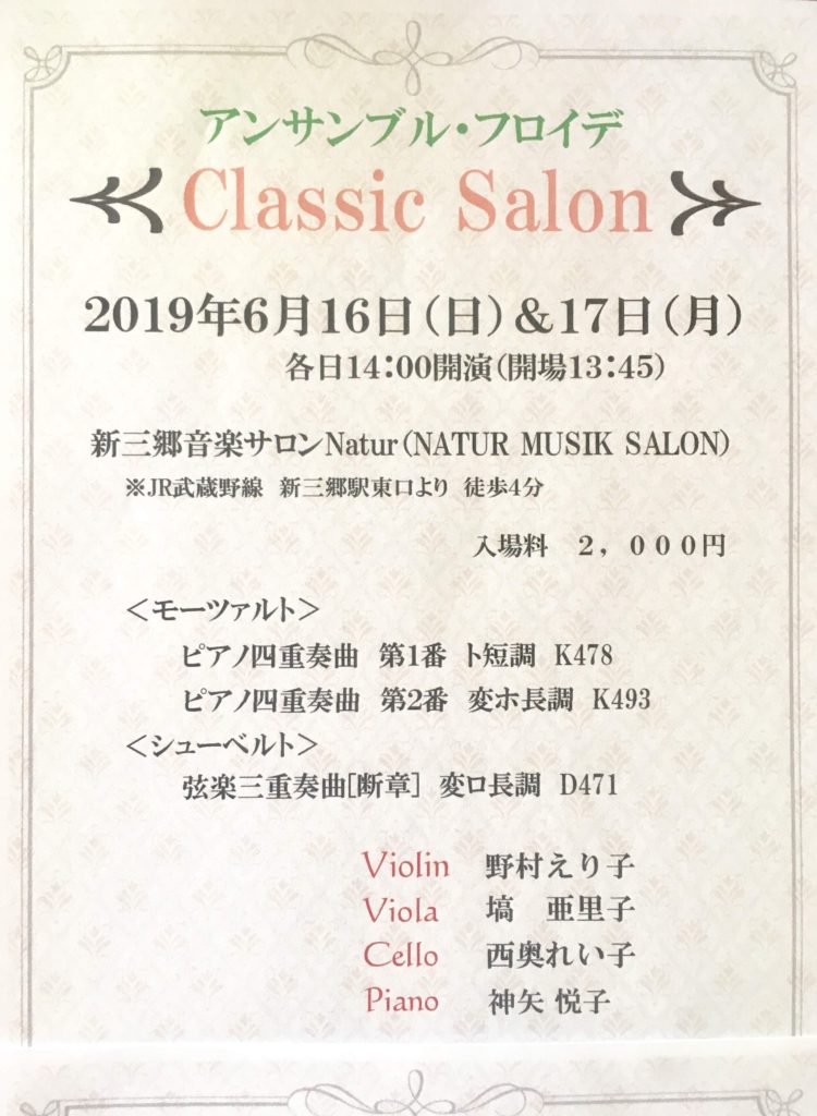 本日はアンサンブル・フロイデのクラシックサロンコンサートでした。プログラムはモーツァルトのピアノカルテット1番2番、弦楽トリオのシューベルトの断章など演奏しました。